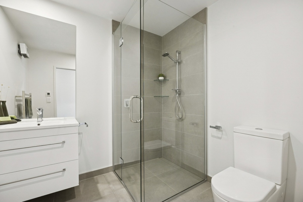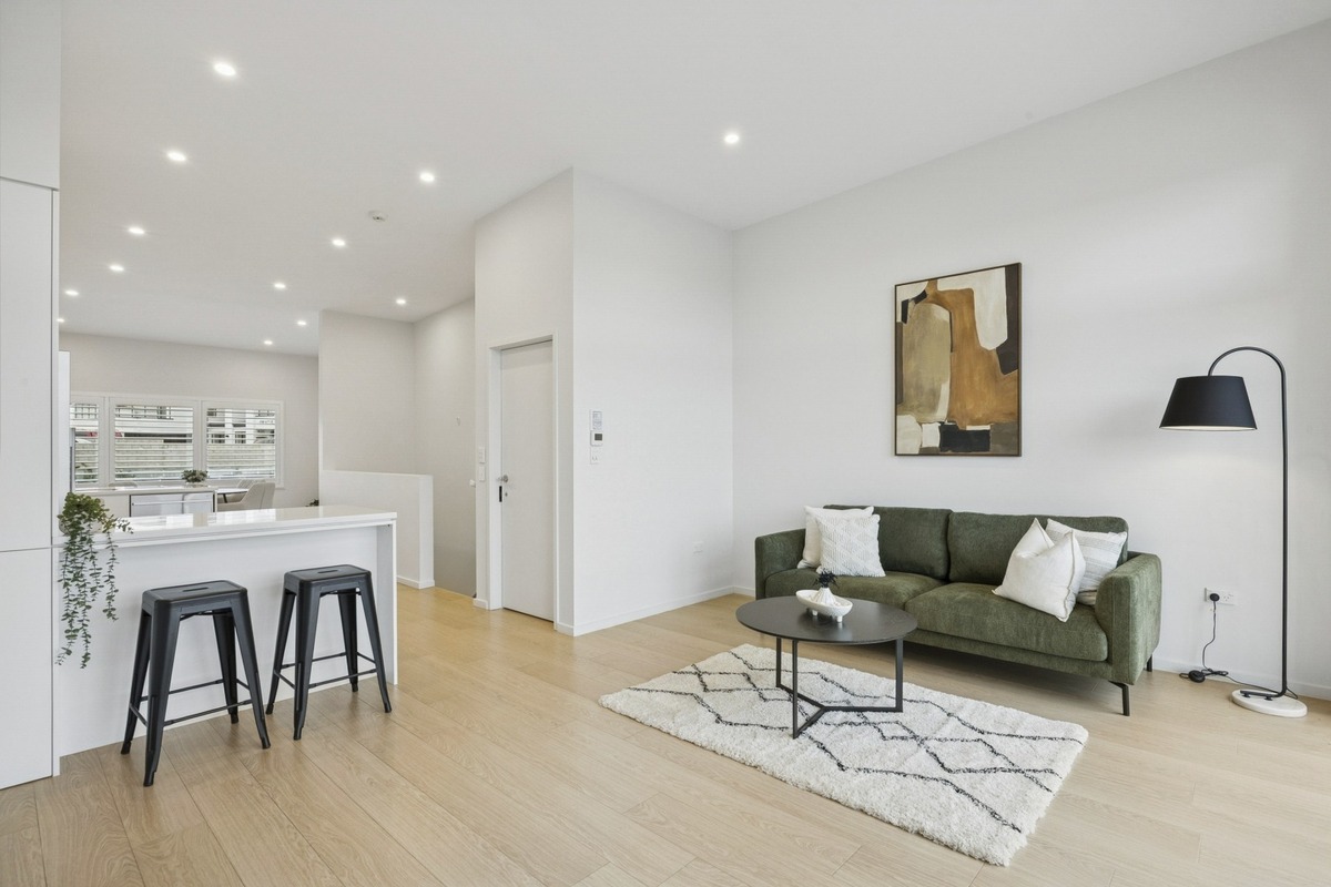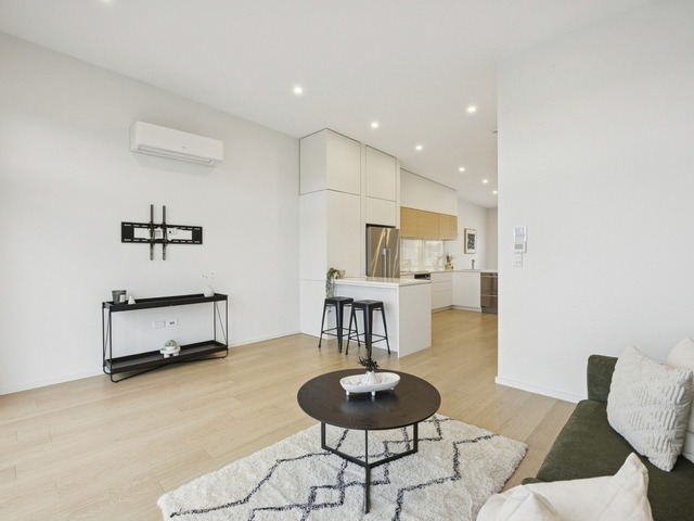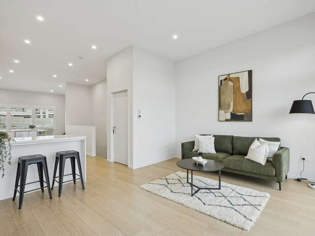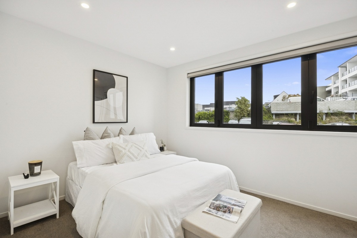 The master suite is a luxurious retreat with walk-in robes and a heated tiled ensuite featuring an oversized shower, dual vanities, and a separate bath, while a second double bedroom is serviced by an equally elegant, tiled bathroom. A third bedroom on the entry level adds versatile accommodation for guests, a home office, or hobby space. Designed over 155sqm, the open-plan living area features three-metre-high floor-to-ceiling windows that flood the home with natural light, highlighting the high stud and sophisticated contemporary finishes.