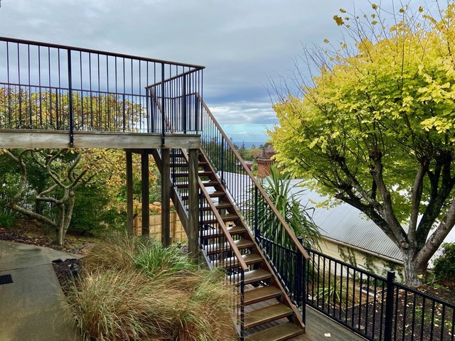 The main large living area has a Jetmaster open fireplace giving the experience that only open fires can. From the French doors you walk out to the elevated deck giving views over the city.